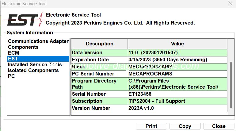 Perkins EST 2025A Software (Electronic Service Tool) met ingebouwde fabriekswachtwoordengenerator